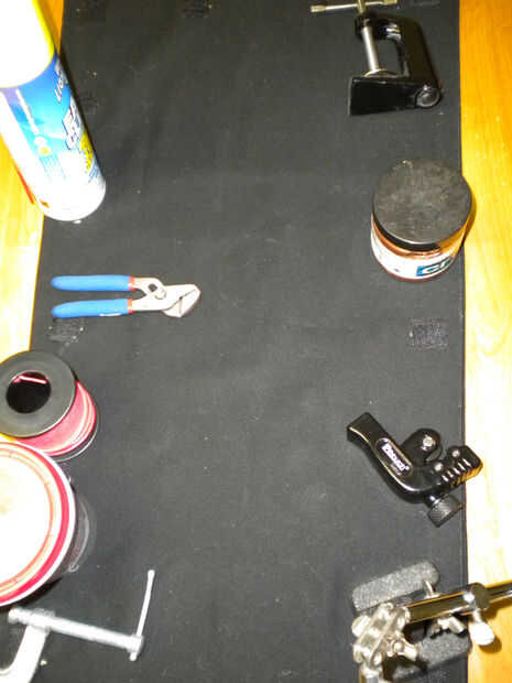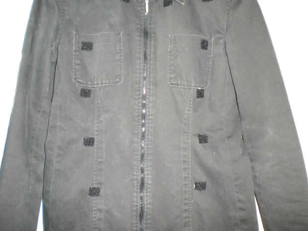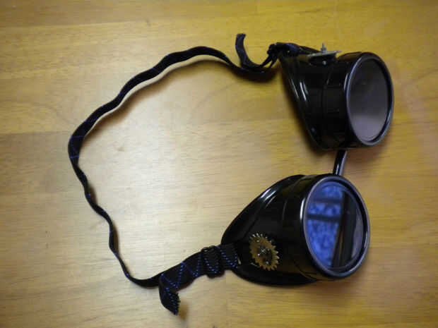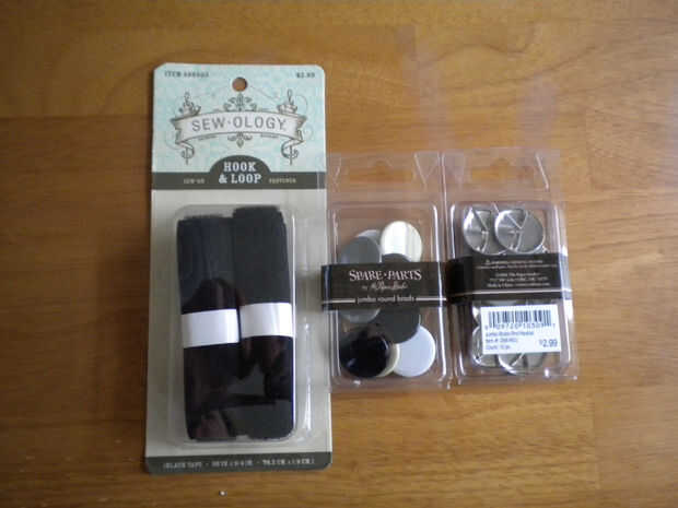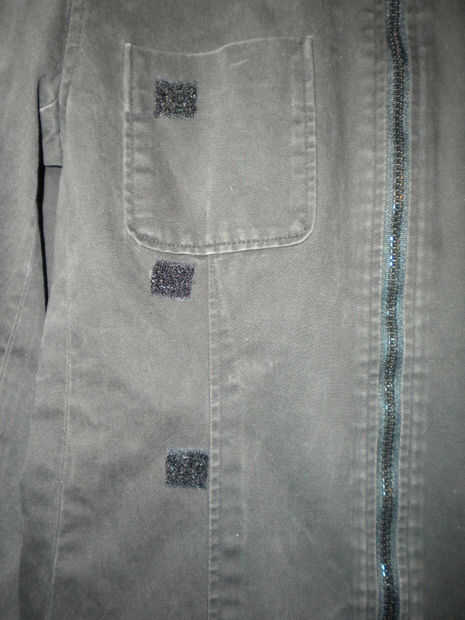 Chaqueta: La chaqueta principal fue comprada en el fondo de comercio por $5.99. Hice un panel de tela para asemejarse a una chaqueta de Rocketeer - la tela fue comprada de Hobby Lobby por $3.99 y fue 1/2 yarda doblada por la mitad para que sea más grueso; los "botones" se hicieron de clavitos de gran tamaño que fueron lijados y pintados de un color bronce (con pintura acrílica que ya tenía) y también comprar en Hobby Lobby por $2.99 por un paquete de 12 (necesitaba 14). El panel fue unido a la chaqueta con trozos cuadrados de velcro negro atado detrás de cada botón (con pegamento para madera gorila * no se recomienda!, pero mi pegamento y epoxy tenían ambos pegados se cierre así que era todo lo que tenía).