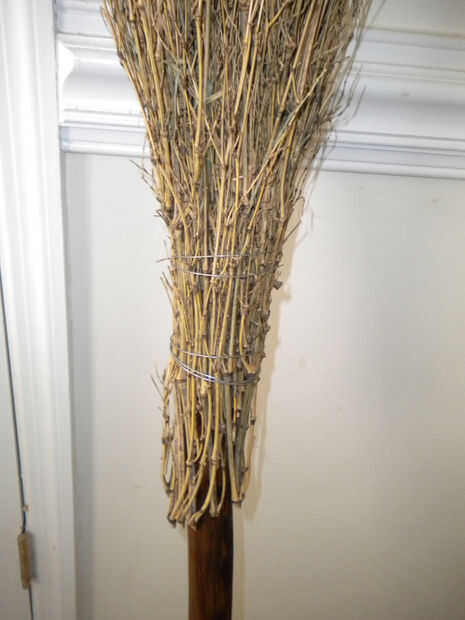 Escoba: Compramos un cepillo decorativo en el Publix para $7,99 pero tenía un bambú palillo que parecía bastante mala, para eliminar las cerdas desde el palo de bambú y la pusimos en nuestro propio palillo grande, bastante recto nos encontramos en un paseo por la naturaleza. Me pela la corteza del palo, arena y entonces teñido un color nogal oscuro con manchas de madera comprado en Wal Mart. Después de sujetar las cerdas con el mismo cable que vino con, solía bobina de cobre frigorífico pase la escoba y hacer los estribos/estribos.