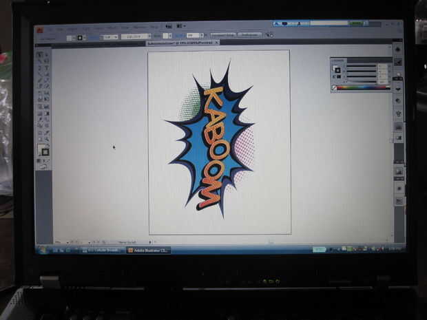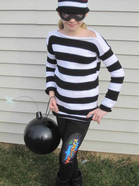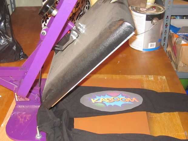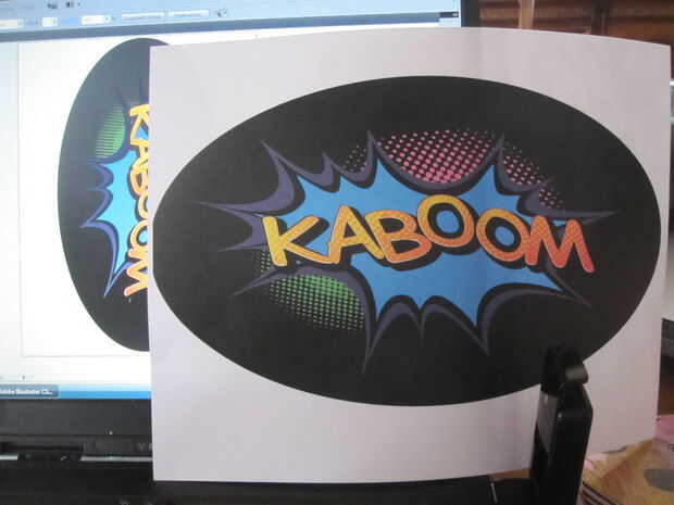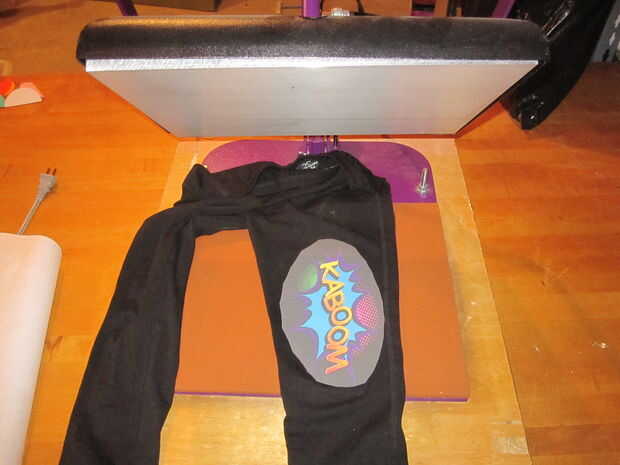 Decidí añadir alguna explicación a este traje descargando un Kaboom gráfico y la impresión en papel de transferencia de calor, luego planchada en un par de leggings negros en color.  No necesitas una prensa de calor para hacer este proyecto.  Tiendas de suministros de oficina venden papel de traspaso térmico para uso doméstico y sólo necesita una plancha para adherir a su ropa.