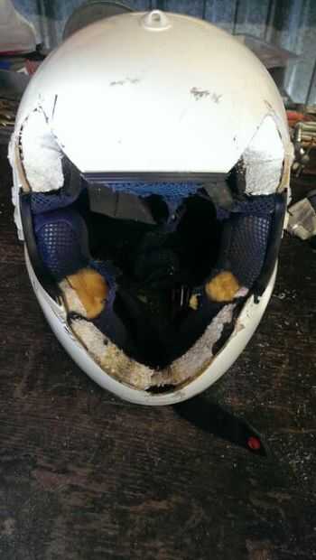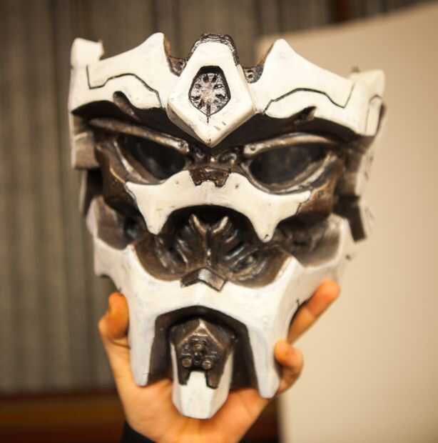 Para nuestra máscara, utilizar lentes de gafas de sol de plástico y utiliza dos partes detrás de los recortes de ojo, montar la careta en un casco de motocicleta corte personalizado que añadimos a continuación otros elementos escultóricos a. Este agregado el beneficio de proporcionar seguridad para nuestro ejecutante del truco.