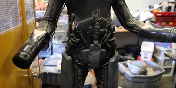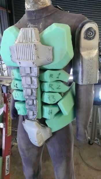 Para nuestros elementos de armadura acolchada, hemos utilizado una espuma moldeada que forma y cortar antes de sellar dentro de látex que pliega alrededor de él. Pega estos moldes para el Body y colocar nuestro caucho moldeado sobre él. En algunas áreas, hemos utilizado la forma moldeada para producir un detalle más en áreas que no han de tiempo o la inclinación para hacer un molde para. Se puede ver en una de nuestras imágenes que hemos utilizado esta técnica para dar el robot algunas más sustanciales "costillas". Utilice un adhesivo rociado en la parte posterior de las piezas a adherir al mono.