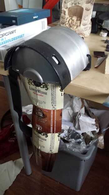 Las latas, que formarán el manica, primero se cortan a la forma preferida y tamaño con una tijeras normales. Usando un clavo pequeño agujeros son perforados (en el centro) para poder coser las latas a un pedazo de tela. Antes de empezar la costura, el tejido es primero cortar a medida. Después de la can-'escalas' están dispuestos hacia fuera en la tela y cosido a mano. Resultó que el metal estaba destruyendo mi traje de músculo, así que no usar al final.