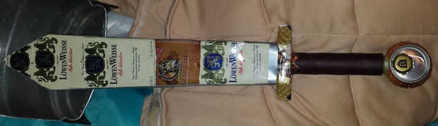 El prototipo se compone de dos latas de cerveza para formar la pieza de la espada. Para evitar que las latas de colapso, llené el centro con cartón y espuma. La otra espada madera ligero cubierta con latas de cerveza, estos se unen con clavos pequeños. El borde se cubre con cinta aislante para seguridad.