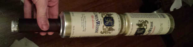 Empecé con un tubo de cartón y pegado el mismo falso cuero que usé para el cinturón para crear el mango. En el orificio inferior está montado un pequeño tubo que puede ser cerrado y utilizado como un vaso de bebida. Todas las piezas se pegan con pegamento caliente. La luz del vaso de bebida se cubre con el pomo.