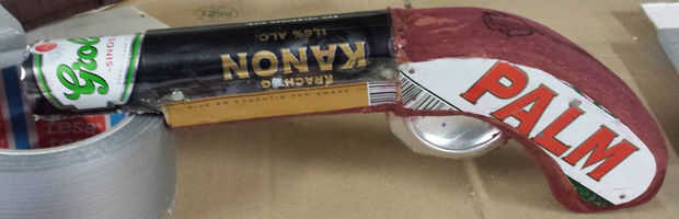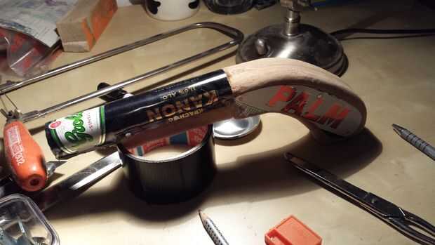 Para el mango usé una cerveza de Bélgica llamada Palm. Una elección obvia para la parte de la pistola que tienes en la palma de su mano. El cañón de la pistola es una especie de cañón miniatura, por lo que la cerveza de preferencia aquí fue Grolsch Kanon(Dutch voor cannon). La pistola está hecha de mdf en aproximadamente 20 minutos o así. Todas las latas son pegadas con cola caliente y clavadas con clavos pequeños. Se tiñe la madera desnuda para darle un bonito color. El gatillo está hecho de una parte inferior parte af un corte por la mitad y pegado a la pistola caliente. Como un extra para mi niña me quemo una rosa en el mango.