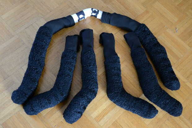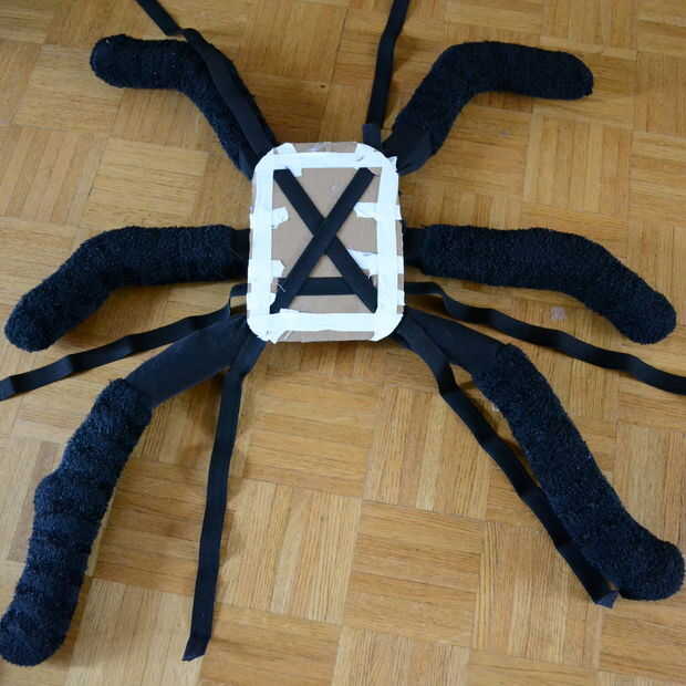 Las patas de la araña fueron hechas con calcetines negros rellenos con periódico y bolsas de plástico de alimentos. Un palillo firmemente con cinta una tira de cartón e inserta en cada uno de los calcetines les impedidos doblar.