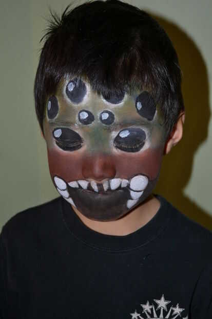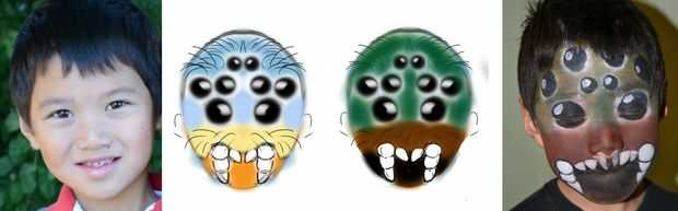 Decidí probar la pintura de la cara, pero tenía la sensación de que mi niño de 7 años no era el mejor candidato para que me deje experimentar de él (no una sorpresa, correcta?). Así que utilicé Autodesk Sketchbook Mobile Express y había esbozado algunos diseños diferentes de un par de días antes de Halloween. Mi hijo le gustaba los dibujos de muestra tantas que él decidió definitivamente vale sentarse todavía - de los 15 minutos me llevó a aplicar el maquillaje.