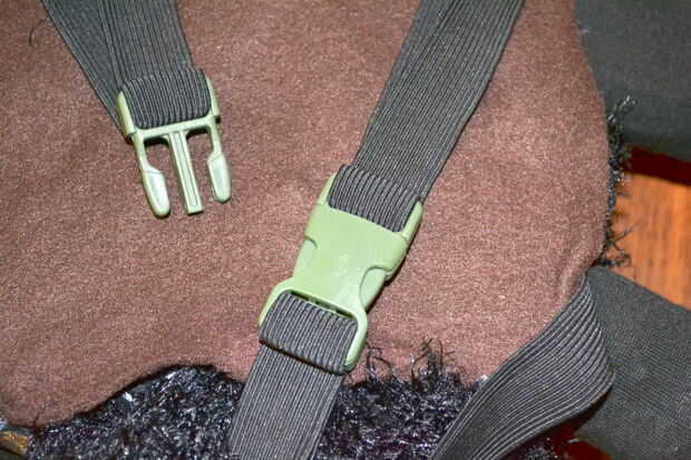 El cuerpo y las piernas fueron atadas a la espalda de mi hijo (muy parecido a una mochila) usando las correas de hombro moda de elástico negro grande y verdes sujetadores de una vieja caja de almuerzo de Old Navy.