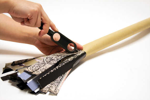 Envolver todas tus páginas revistas corte alrededor del tubo de papel y capa como desee. Utilice el punto extremo de Makedo segura-Sierra para perforar un agujero a través de las páginas de la revista y el tubo de papel.