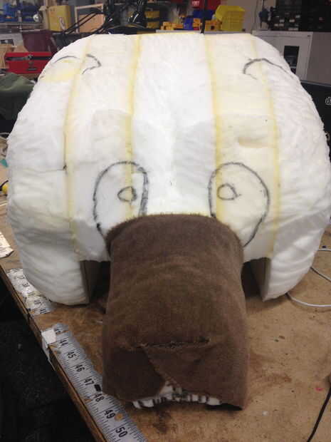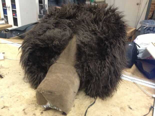 Para la diversión parte! Momento de empezar y en tela. Además de la piel del faux que compré tuve algunas tela fuzzy de pila baja que utilizo para la cara del oso. Seguía usando mi adhesivo en aerosol para fijar a la tela a mi espuma, pero cambiado a pegamento caliente cualquier momento que tuve que pegamento a la tela. El pelaje largo es bastante indulgente de las burbujas poco mientras que usted está pegado, pero para nada que querrás tener cuidado realmente suavizar cualquier burbuja que se destacan los detalles tallados en su espuma. En lugar de cortar mi exceso en la parte inferior de la cabeza, lo dejé suelto para que más tarde pude adjuntarlo en el interior del casco (de modo que el casco no es visible). Una vez que terminé mi base de tela usé tijeras para recortar el pelo en la cara del oso alrededor de los ojos y la nariz.