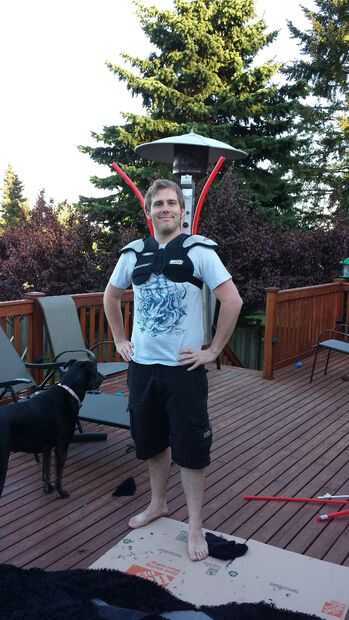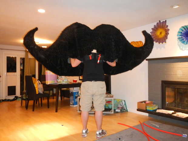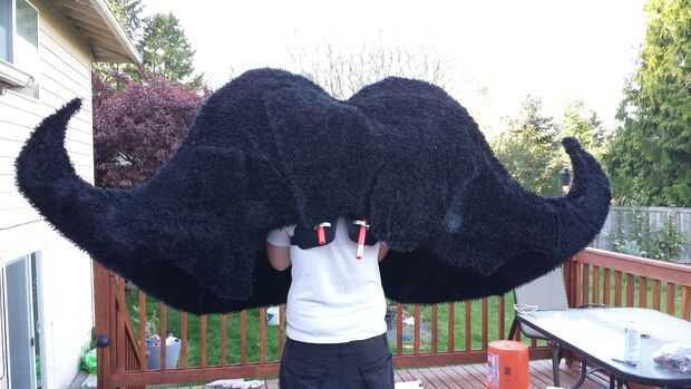 Las aberturas fueron cortadas en la zona donde se encontrarían las fosas nasales y una aleta de tela fue agregada para ocultar el corte. Esa manera usted puede ocultar los brazos para dar un perfil de bigote limpio o ponerlos hacia fuera para una sensación de personaje de dibujos animados.