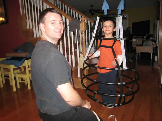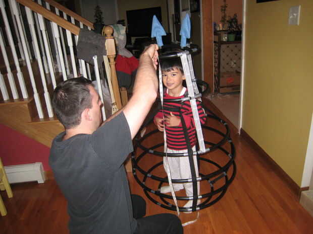 Lo que haría en el futuro sería poner en uniones en t en el aro superior de la parte inferior la mitad (el aro pasado antes de suben las correas para los hombros). Puesto 4 de estas juntas t tan uniformemente como sea posible. Luego conseguiría las juntas transversales para el aro siguiente que estará a la altura del hombro. Las juntas transversales la dan el hombro aro rápido-equipado del asimiento un lugar para sentarse y coloque ambos el marco inferior en el aro de la cabeza. Otra vez, utilizaría uniones en t para fijar el aro superior y/o estructura al aro de hombro.