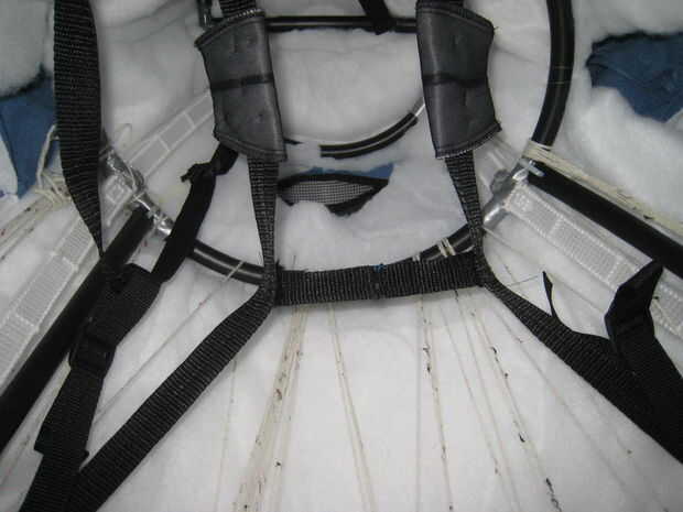 Con el marco hecho tuve los chicos intentarlo nuevo. En este momento mi principal preocupación era que las correas se estable. Decidí añadir un cinturón usando el mismo material de la correa que se fijan a la estructura. Se puede ver en las fotos, pero nunca lo usamos. La razón que nunca lo usamos fue que tan pronto como tuvieron sus brazos por el traje bastante guardó lo deslice hacia abajo. Así puede ignorar ese tipo de cosas como señalan en los cuadros.