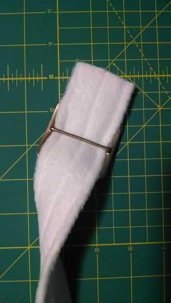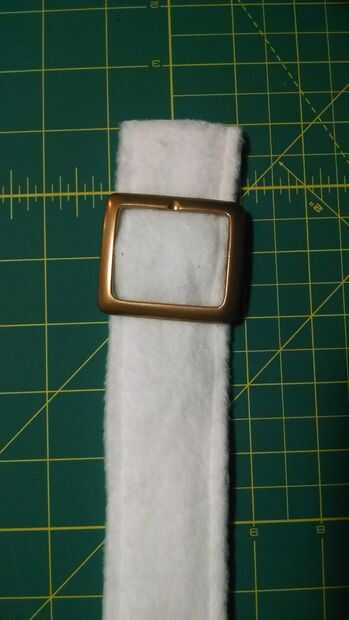 Mientras el pegamento se seque creamos las correas del calzado. Las correas están hechas de lana blanca que hicimos en una cinta básica como forma. Había encontrado las hebillas que empareja perfectamente, pero tuvieron que ser pintado el oro como color. Me quitan la punta de la hebilla así. Me Deslice la hebilla en la correa y puestas en su lugar en el zapato. Teniendo en cuenta que lo único que tendrá la cinta en su lugar estará pegado a la parte inferior de la espuma gris piezas. Puso un par de puntadas alrededor del perno central de la hebilla para sujetar en su lugar.