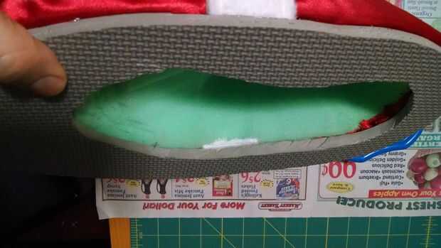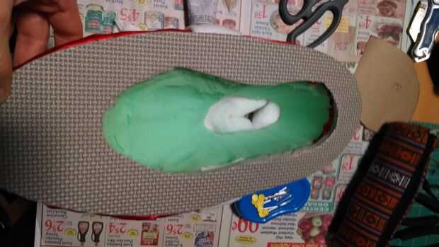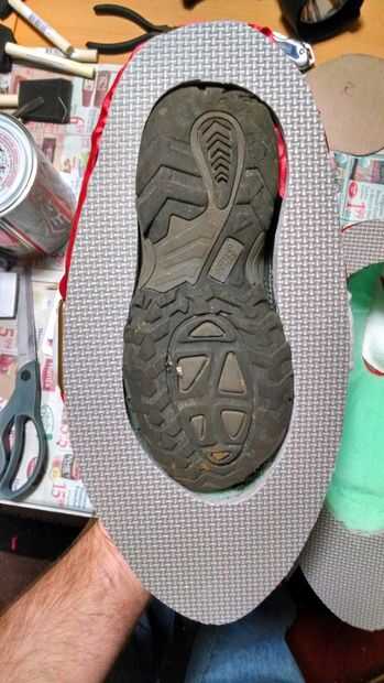 Luego pegué la espuma gris en la parte inferior de la zapata con E6000 otra vez. Para ello, comprimido el zapato para que la tela se pegue al borde de la espuma gris.