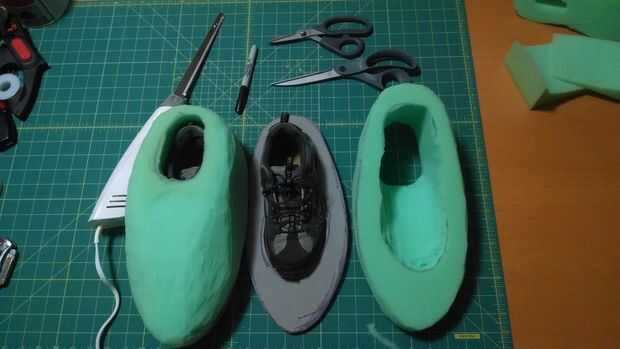 Luego utilicé la espuma inferior trazar el diseño a 4" pedazo de espuma. Luego cortar la espuma con un cuchillo eléctrico. Me dibujaron los perfiles diferentes en cada lado luego tallado con unas tijeras. También corté el interior por lo que habrá espacio para poner el zapato.