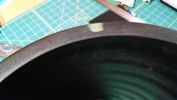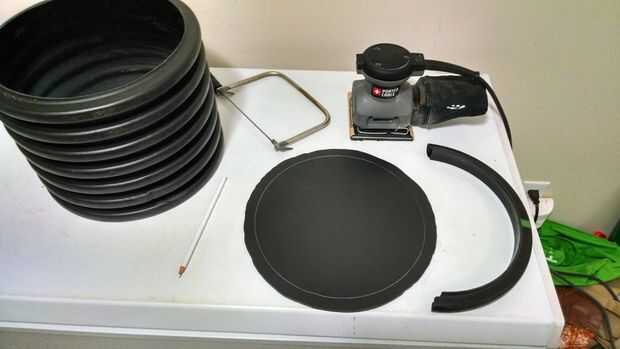 Tenía una lámina de plástico puesta alrededor de un traje anterior que usé para hacer la parte inferior de la cubeta. Cuando pega esta hoja en la parte inferior de la tubería, corté la pipa hasta el borde del un anillo. De esta manera maximiza el pegamento para adherirse a la superficie. Luego localizar el tubo en la lámina de plástico y utiliza una sierra de marquetería para recortar la parte inferior.