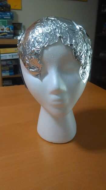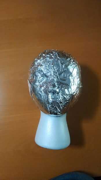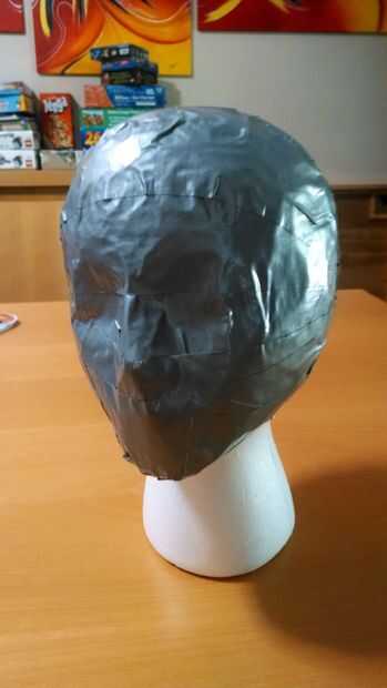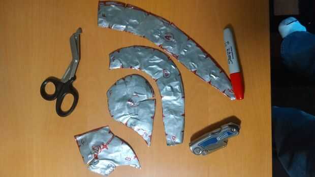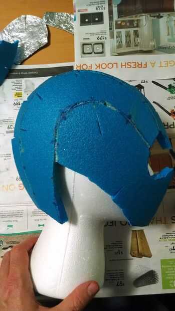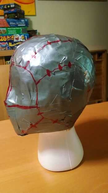 Cubierta la cabeza con papel de aluminio y cinta adhesiva. Luego dibujó una plantilla a la mitad la cabeza (en realidad dibujó en ambos ya que me estaba haciendo otro traje de otro hijo). Cortar la plantilla de la cabeza de espuma de poliestireno y cortar ranuras perpendiculares para que todas las piezas en posición plana.
