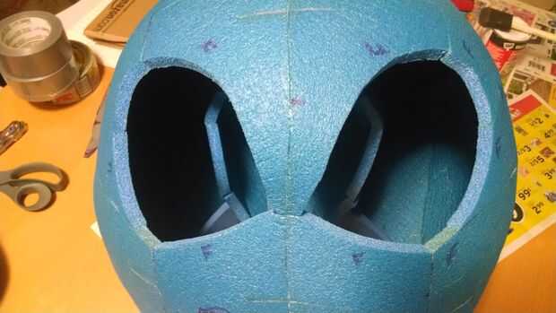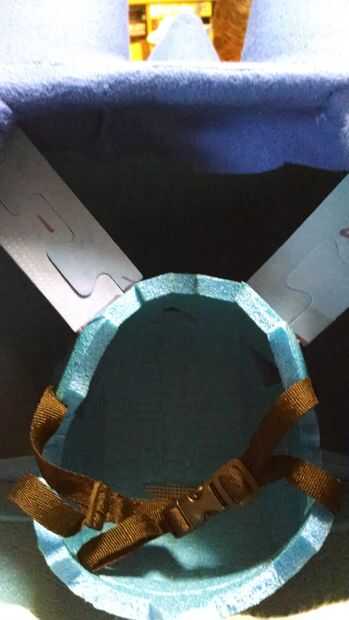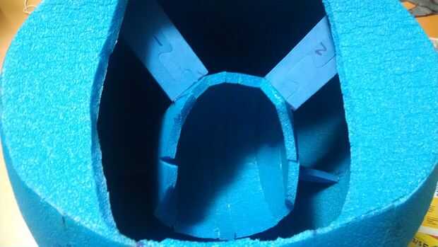 Tuve mi hijo puso el casco, luego poner la gran cabeza sobre eso. Utilizando una cinta métrica de tela tomó algunos números ásperos y hace apoyos entre la cabeza grande y el casco. Que seis Contacta con apoyos de la espuma más recta y más rígida, azulejos de suelo.