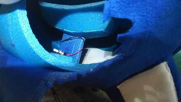 Hice un montaje de la espuma azul para la batería. Puse la batería y el interruptor a la vuelta de la llave superior que se coloca por la frente. Permite el acceso relativamente fácil y ayuda a contrarrestar algunos del peso de la espiga que es la parte de atrás de la cabeza.