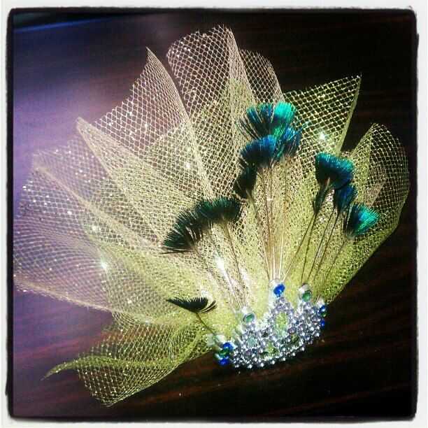 Corona con plumas de cabeza de pavo real y Tul pegado en una corona de juguete de plástico
