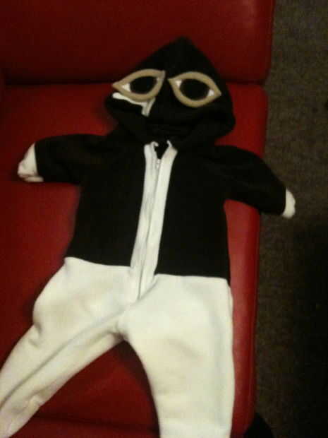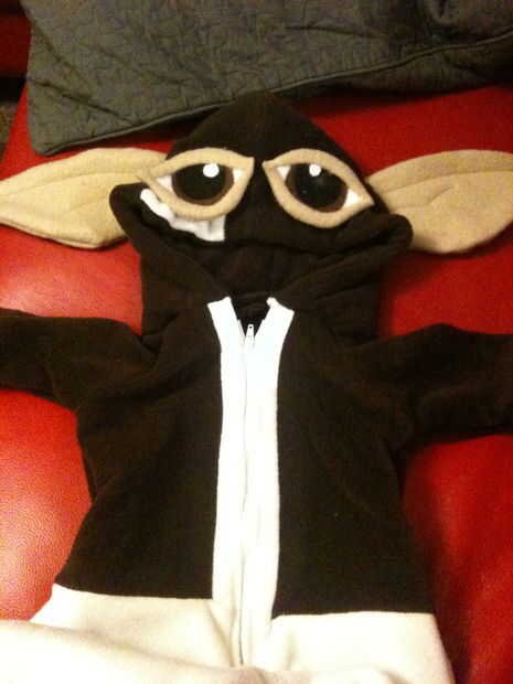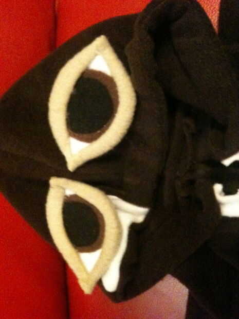 Luego corte un pequeño agujero en el capó y cosió las orejas en su lugar.
