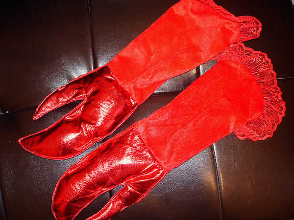 Corté las mangas de traje (porque eran demasiado cortos) y convertido en guantes de noche. Todo lo que tenía que hacer era coser cordón rojo para las tapas! Aun no soy bueno en la costura; Si puedo hacerlo tú también puedes!
