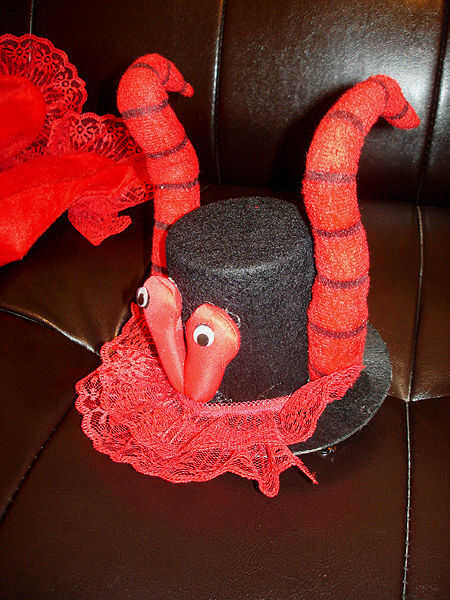 Cómo hice esto fue cortando cada ojo termina tentáculo, la abierta de costura y coser los extremos de los círculos de fieltro negro, creando una base que sería más fácil caliente pegamento en el sombrero (un refuerzo tapa sombrero de fieltro que encontré en la tienda de artesanía).