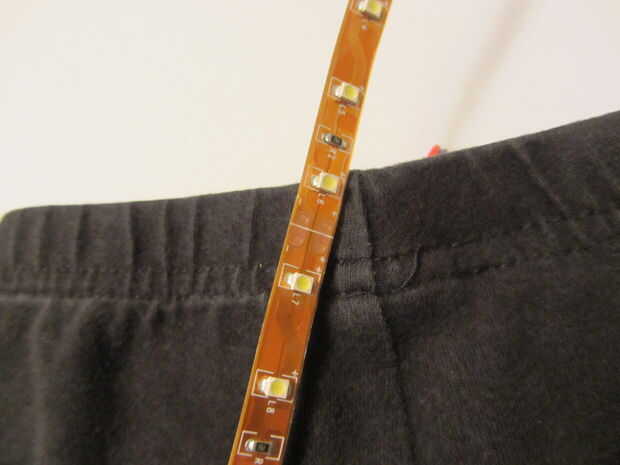 Ahora que conoces son los LED en sets de 3, usted querrá medir cuánto cada tira será para las distintas partes del traje. Necesitará una tira para cada brazo, cada pierna, una "espina" que desciende de la parte delantera de la sudadera con capucha y una cabeza que pasará por la parte exterior del borde frontal de la campana. Lo mejor que puedas para cortar las tiras a la longitud entre los contactos mencionados anteriormente.