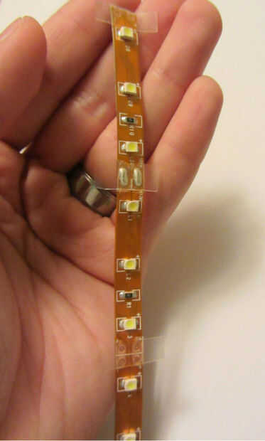 Para cubrir los contactos, cortar pequeños trozos de cinta aislante sólo lo suficientemente ancha para que cubren los contactos 4 círculo y el área circundante de cobre. No doblar la cinta detrás de la tira, sin embargo como que quitar el papel de la parte posterior pegajosa mucho más difícil. Puede ser más fácil hacer este paso después de haber soldado todas las conexiones juntas pero me pareció más fácil hacer la cinta antes de que se suelda porque una vez que todo soldar entre sí, tienen un sistema muy largo de LED para manejar.