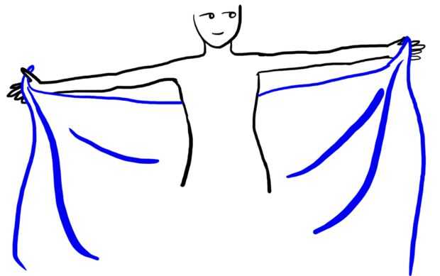Comienzo sosteniendo una esquina de la tela en una de sus manos. Deslice la otra mano a lo largo de la tela, hasta que los brazos están completamente extendidos. Como soy 5'8 ", esto me dio un áspero cuadrado de la altura de los hombros al suelo. Puede variar el ancho de la tela si eres más alto o más corto.