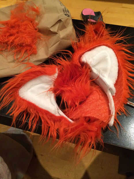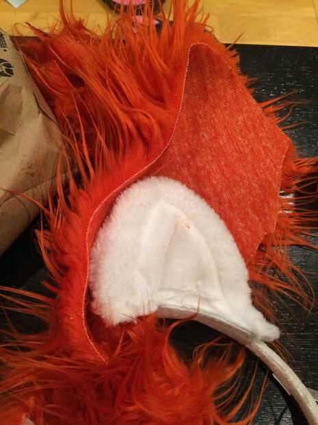 1) Utilice una venda del oído de gato blanco en cualquier tienda de Halloween y restos de exceso de piel sintética para cubrirlas. Usé pegamento para tela faro para aplicarlos.