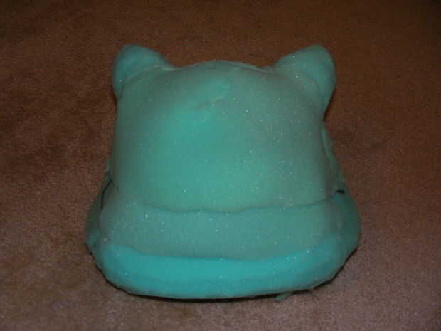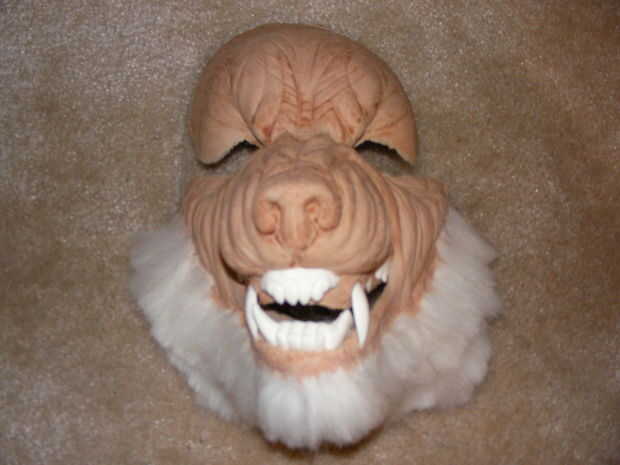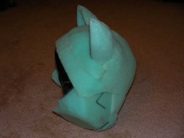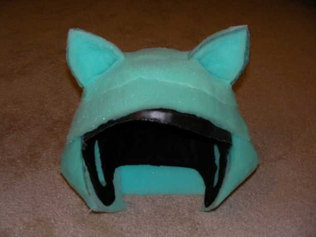 Hice el resto de la cabeza de un casco de fútbol americano estilo viejo de traje de la piel artificial de una tienda de vestuario local. Cortar tiras de espuma y me había pegado con el adhesivo Super 77. Una vez que tuviera la forma apropiada, después cortado alguna oreja en forma de piezas de espuma y había pegado a la parte superior de la cabeza. Cortan los agujeros en una tapa de noche (eBay) para acomodar las orejas y lo puso en la cabeza.
