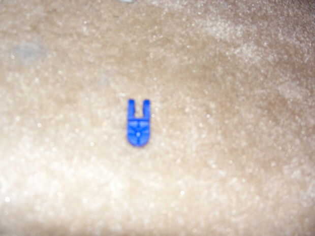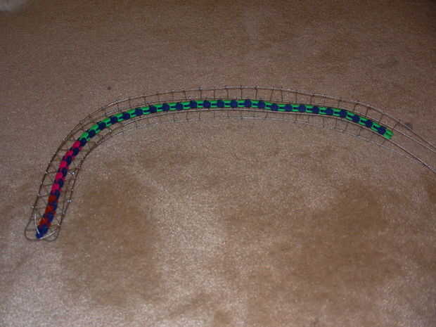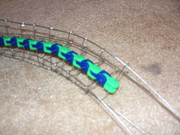 Luego tienes que taladrar dos orificios en cada Klix. Después de taladrar los agujeros, vuelva a colocar el Klix juntos. Necesitará un clip para papel jumbo de tamaño para cada hoyo. Básicamente enderezar cada clip de papel, cortado con el tamaño correcto e hilo de rosca en los agujeros y luego doblar un asa en cada extremo del clip de papel. Entonces usted hilo cable de freno de bicicleta a través de cada bucle hasta llegar a algo que parece el esqueleto de la cola en la foto.