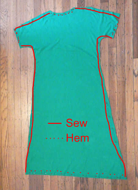 TL:Dr - camisa de la traza en la tela, añadir extra para la parte inferior del vestido, cortar y coser.
