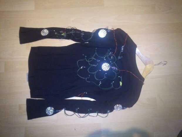 Un basados en Arduino movimiento sensible ligero trajeTambién puede mostrar patrones y tal aunque sólo la detección de movimiento en el vídeo. Utiliza un acelerómetro ADXL335 para detectar el movimiento de los portadores. Mi amigo Dave amablemente pu