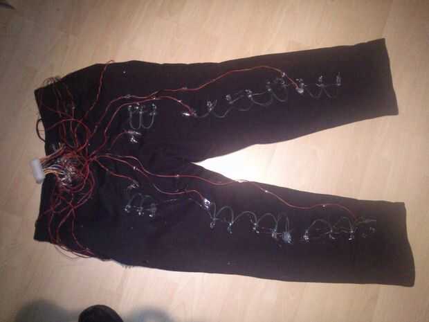 Un basados en Arduino movimiento sensible ligero trajeTambién puede mostrar patrones y tal aunque sólo la detección de movimiento en el vídeo. Utiliza un acelerómetro ADXL335 para detectar el movimiento de los portadores. Mi amigo Dave amablemente pu