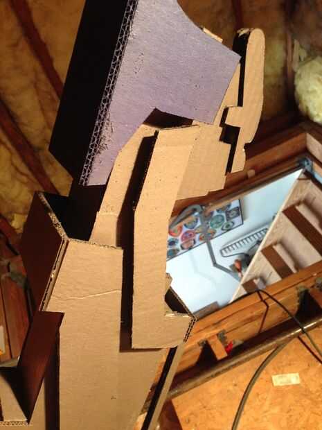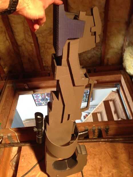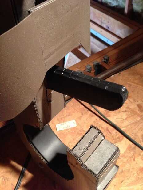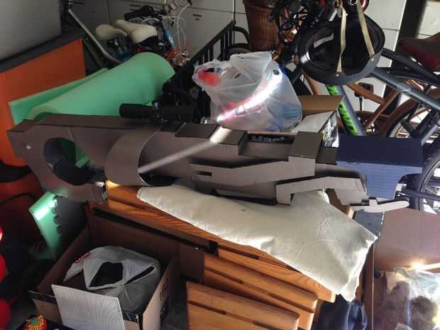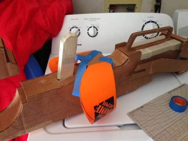 Comencé investigando en internet y encontrar una imagen de la pistola que me ha gustado. Imprime en película de transparencia. Grabó algunos cartulina a la pared y proyecta la imagen en la cartulina y movido hacia atrás hasta que era del tamaño que quería. I localizar la imagen en la cartulina, luego dobla la cartulina por la mitad y con cinta los bordes para mantenerlos juntos. Partes de la imagen calcada que iban a ser más grande que el cuerpo básico de la pistola o del lado, trazó en papel por lo que tendría una plantilla del tamaño adecuado para cada parte. Usé un cuchillo Xacto para cortar la forma hacia fuera, y tuve dos mitades ya que el cartón fue doblado por la mitad. Después de que tuviera los dos lados cortados, estima que debería hacer el transmisor de cerca de 3" de ancho, así que corte un montón de tiempo 3" ancho tiras de la cartulina. Comencé en la parte superior de la boca del cañón bláster y comenzó a trabajar en líneas de corte de alivio en el cartón ancho de 3" en cada esquina en las piezas laterales. Seguí este proceso hasta que remonta todo el blaster hasta que llegué a la parte inferior de la boca. El cañón fue dejado abierto. Para las partes curvas, repetía líneas de corte de alivio en el cartón, a veces sólo 1/4", para poder copiar la forma. Usé pegamento artesanal y cinta adhesiva a la parte baja de la 3" tiras a ambos lados de la pistola de bond. Mi idea inicial era utilizar la espuma de expansión en el interior de la pistola en el centro de la cartulina para darle más resistencia y durabilidad. Rociado algunas expansión de espuma y completado luego pegar y grabar la tira restante de 3" a lo largo de la parte superior de la mitad de la blaster. Desafortunadamente, era entusiasta con la espuma de expansión y comenzó a deformar y desarmar mis costuras, así que tuve que quitar de un lado y sacar parte de la espuma mientras estaba todavía húmeda. Luego pegado y había pegado a los lados hacia atrás juntos. Después de secado el pegamento, la cinta fue quitada.