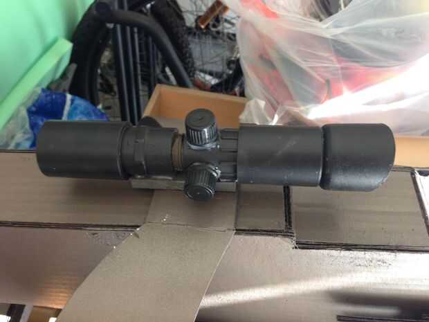 Usé mi tubo de PVC y algunos accesorios para crear un ámbito para el blaster. Uno de los extremos acampanado y curvado, así que usé una mano tronzadora para cortar la parte superior una de botella de agua pequeña en un ángulo suave. La tapa del PVC de la pipa y la botella fueron pegadas juntas para lograr los resultados en las fotos. El detalle final era caliente pegar dos tapas de botella de plástico miniatura en la parte superior y una parte de las posibilidades de las perillas de ajuste.