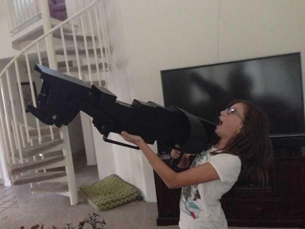 Si vieron la película, sabes que el cohete es una especie de mapache super modificado. Como tal, es el tamaño de un mapache grande. En comparación con su tamaño de cuerpo - su blaster es enorme! Así para traducir eso a una persona vestida para ser un mapache pequeño, necesitaba hacer la pistola muy grande. Lo general blaster es aproximadamente 3 1/2' largo, que todavía no es escalar, pero trabajó bien y era manejable para ella llevar alrededor.
