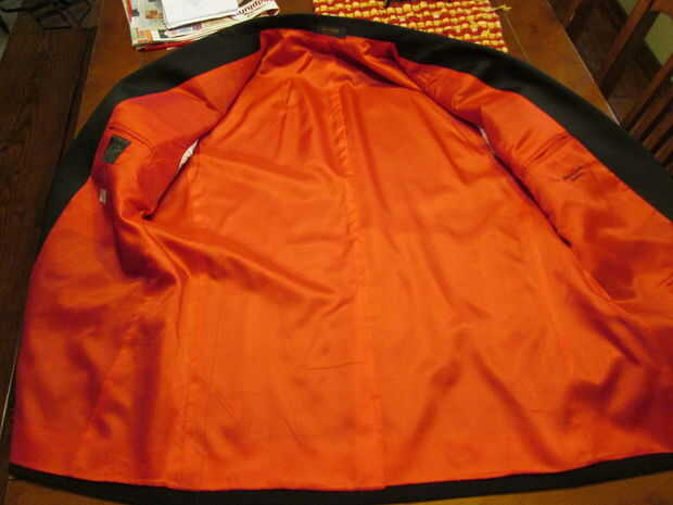 El pelaje es probablemente la parte más difícil de este traje entero. Mi primer pensamiento fue coserlo pero no es tarea fácil. Terminé viendo a través de tiendas de segunda mano para una capa de traje negro con un forro de seda roja. En realidad encontró uno por $7 y compró inmediatamente. Otra opción para la capa sería comprar la capa de traje negro y pegamento caliente o coser rojo de seda en su interior. El único problema que tuve con mi abrigo fueron el hecho de que la capa de Capaldi es bastante largo (casi como un Trench) y que mi cuello exactamente no mira a la derecha. No podía hacer mucho por la longitud de la capa pero me podrian dar la ilusión de que es un Trench. Lo que hice fue que volver a planchar mi collar a una diversa longitud, haciendo que parezca más corta que el resto de la capa le parecen más. Esto era bastante fácil de hacer. Sólo cubrió en su lugar y planchar hacia abajo. Luego cosí otro botón debajo del cuello para que coincida con la capa de Capaldi. Y eso fue todo para la capa del traje.