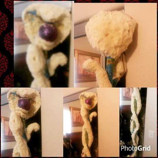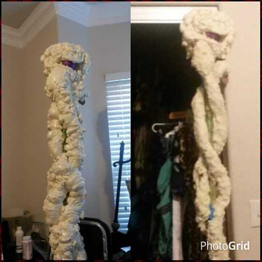 entonces usaba espuma expandida de The home depot (tenga cuidado, esta es la segunda vez que usé este... favor de utilizar guantes y exterior... se pasará hacia fuera y ese tipo de cosas no bajar de su alfombra o manos)... de rociar ambos lados luego montar la esfera y ampliado la espuma lo para que no caiga. Yo depilada con un cortador de la forma que quería de cada serpiente. (hacer esto en la bolsa de basura A su muy muy muy desordenada y ruinas vaccuum)