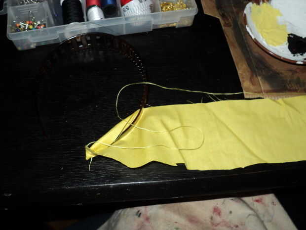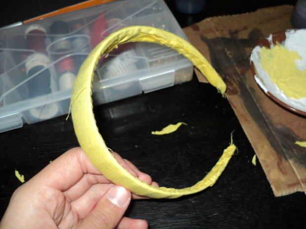 2. Coge tela amarilla cortada en tira de largo y ancho suficiente para cubrir la banda de pelo (ver foto 3)