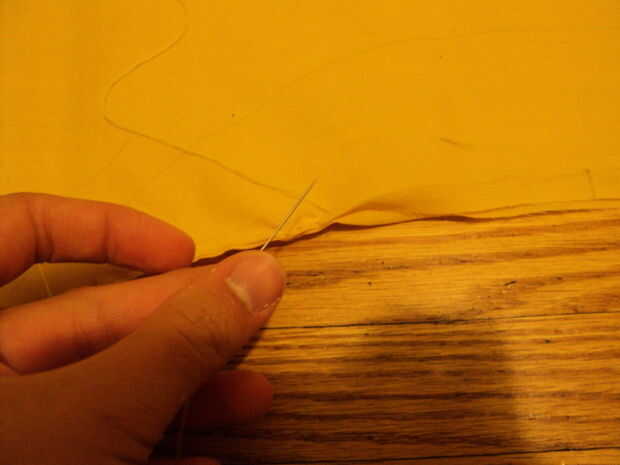 [Nota: para todos los bordes que se cortaron: pliegue en el extra 1-2 cm de la tela en ambos lados para evitar que se deshilache más adelante] (Foto 1)