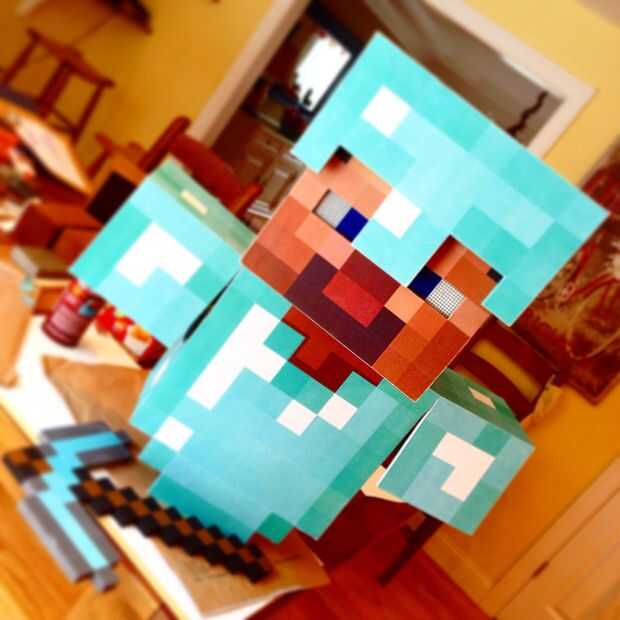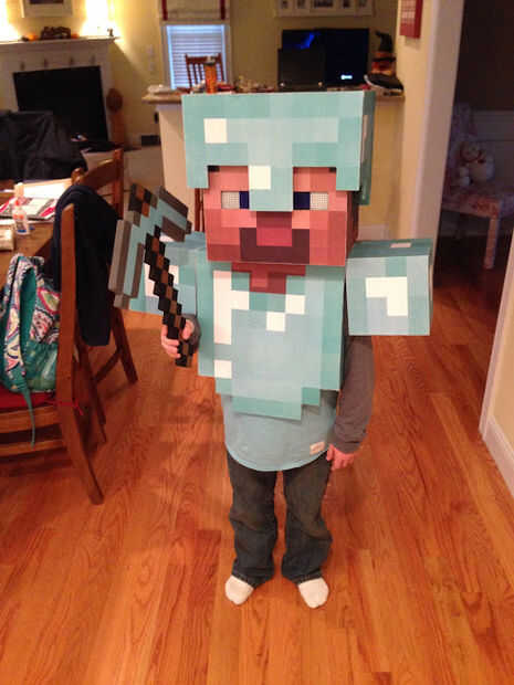 Este traje de Minecraft fue hecho de papel, cartulina, cinta embalaje, madera y metal que destella.