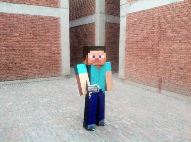 Mi hijo le encanta Minecraft. Quería ser Steve para Halloween así que compré algunos pintura y cartulina y se puso a trabajar. Quería que mi hijo para poder caminar, ver con claridad, poder girar la cabeza (para mire a ambos lados antes de cruzar la