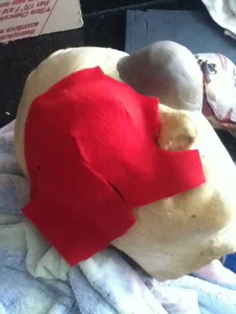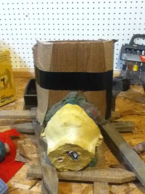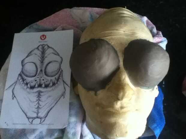 Para obtener los ojos funcionales y en el lugar correcto, he utilizado un molde de mi cabeza que hice para este tipo de proyecto. Con poco de aceite de base de arcilla, había esculpido ojos grandes directamente sobre el molde. Comparando con mi dibujo del concepto, me aseguré que eran lo suficientemente grande, correctamente colocado y simétrica. Una vez hecho esto, me preparé para hacer un molde. He utilizado cartón y aceite basado en arcilla para hacer el bien alrededor de los ojos. Una vez hecho esto, cubrió el interior entero con vaselina para evitar que el yeso adhiera a sí mismo en mi cabeza del molde. Después de mi yeso fue preparado, vertió lentamente en el formulario, asegurándose de evitar burbujas de aire. Una vez rellenado, dejo este conjunto durante varias horas.