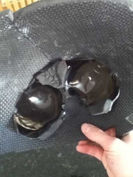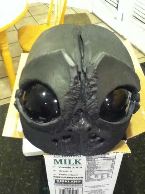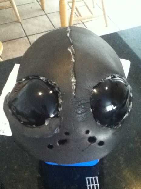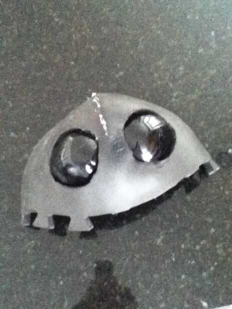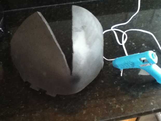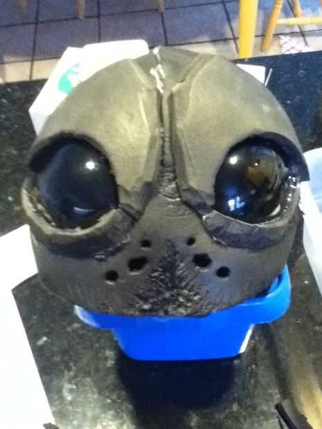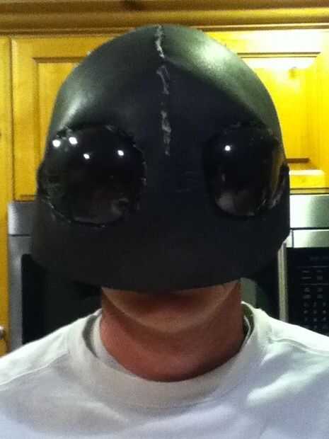 Empecé con un pedazo grande de la espuma de EVA y con mi pistola de calor, comenzó a moldear en la necesidad de la forma de la máscara. Tuve que recortar un triángulo grande para crear el formulario. Una vez que la forma general se logró, me caliente pegué juntos. Entonces era capaz de poner los ojos en su lugar. Mida con cuidado donde van y luego lentamente cortar los agujeros hasta que los ojos eran capaces de pop a través de. Luego los pegué en su lugar. Con los ojos en la posición correcta pude iniciar la parte de la parte superior de la máscara. Esto se hizo de manera similar al frente, sólo con más recortes para hacer la forma de trabajo. Entonces yo sólo caliente había pegado todo en su lugar.