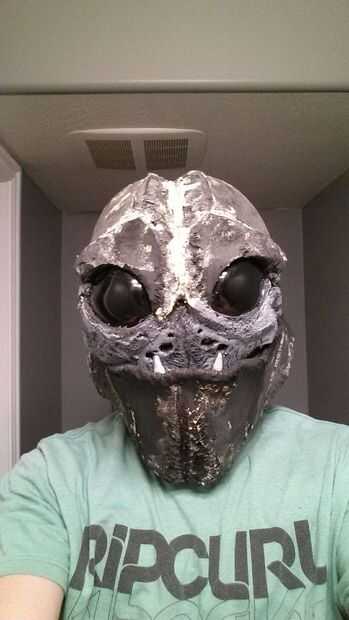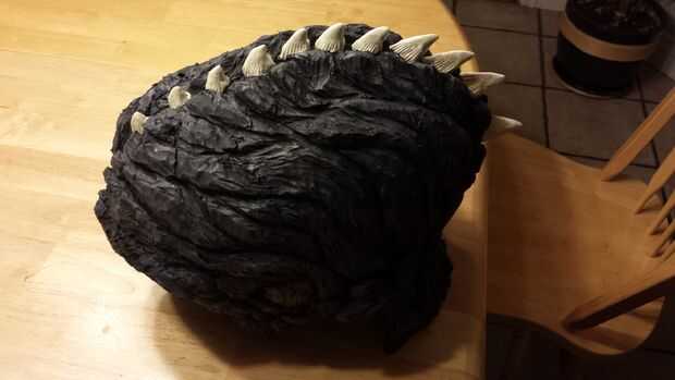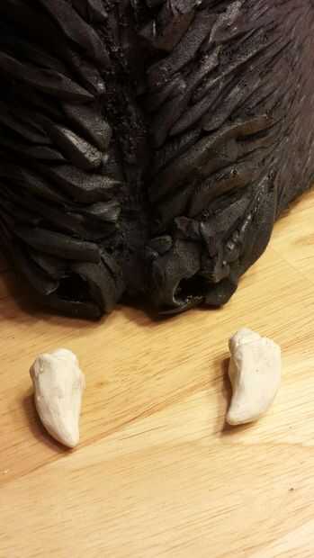 Empecé con los dientes. Yo simplemente rodé algunas formas puntiagudas y mide con la máscara para asegurarse de que eran del tamaño correcto. Y horneado en el horno. Después de eso, me caliente había pegado en su lugar. Tenía que asegurarse de que no eran sólo un blanco inmaculado (¿qué monstruo tiene buena higiene oral?), por lo que regó abajo algunas pinturas acrílicas le dio un color amarillo para que parezcan más viejos y bien usado.