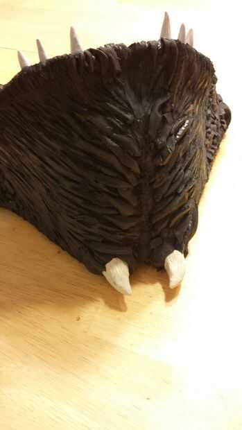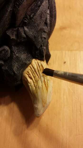 Los cuernos se hicieron básicamente del mismo modo, sin embargo, mirar más como cuernos adecuadas que necesitaban más textura. Esto fue hecha con un palillo de dientes. Sólo empujé en crestas poco alrededor del cuerno entero, haciéndolos más profundo en la base para que la punta del cuerno permanecer suave. Luego los pinté de una manera similar. Con los cuernos, he añadido un poco más marrón para ir en las grietas. Entonces eran sólo calientes pegado en su lugar. He añadido algunos cuernos adicionales en la mandíbula a balance las cosas.